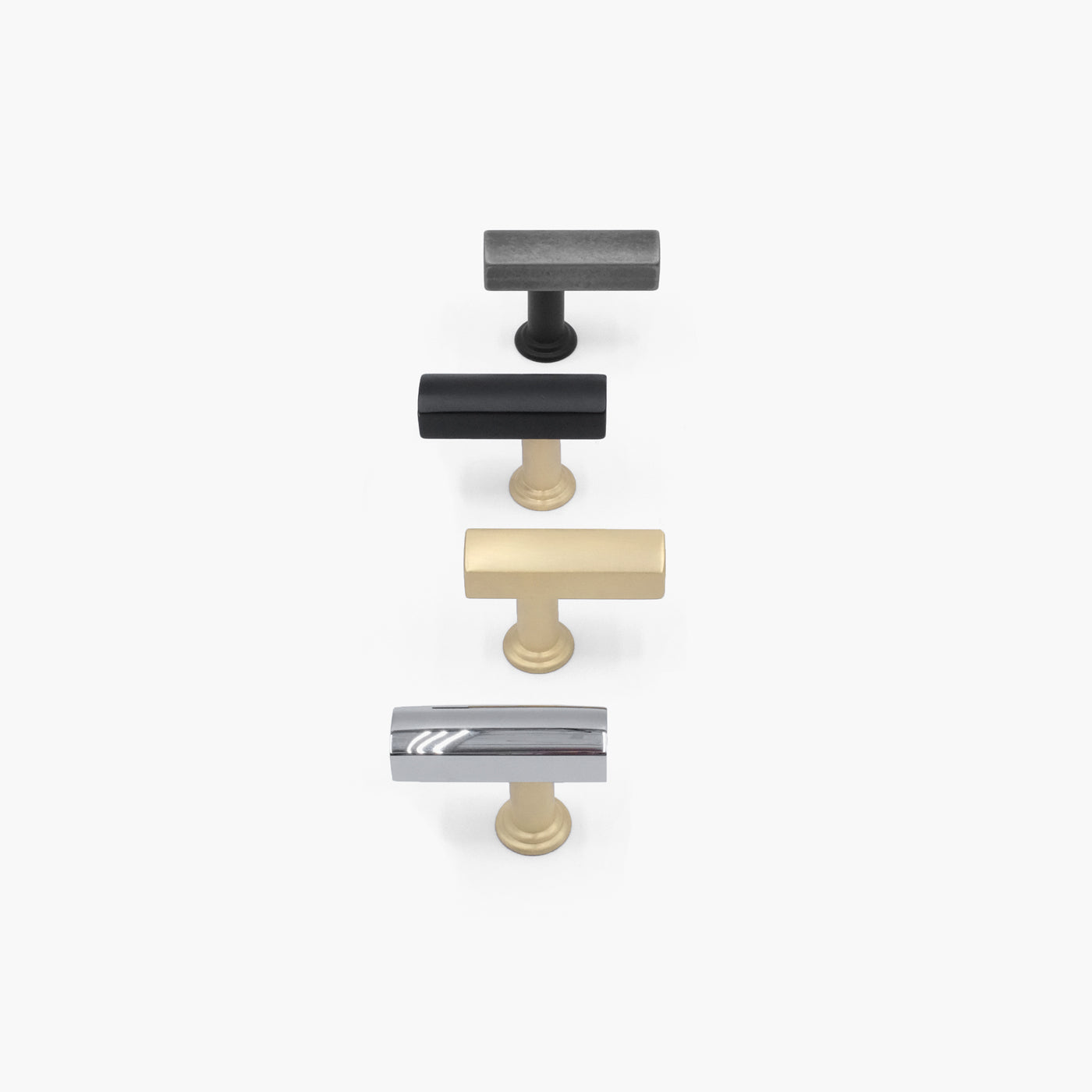 One standard size, five finish combinations, solid brass construction. The Mod T-Knob works great on cabinet doors, drawers, most anything that can open, or on your walls as a hook.